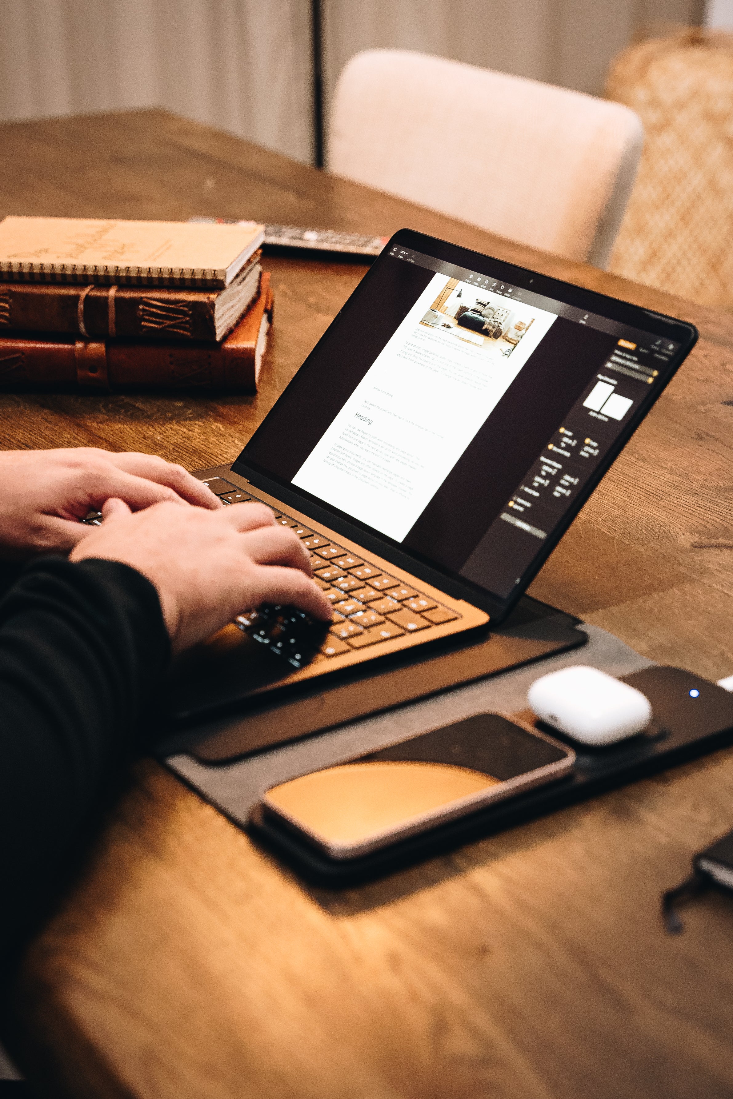 Den trådløse opladning er indbygget i sleevet og fungerer ved at placere din telefon eller AirPods på det dedikerede område. Kompatibel med MagSafe og Qi-aktiverede enheder.