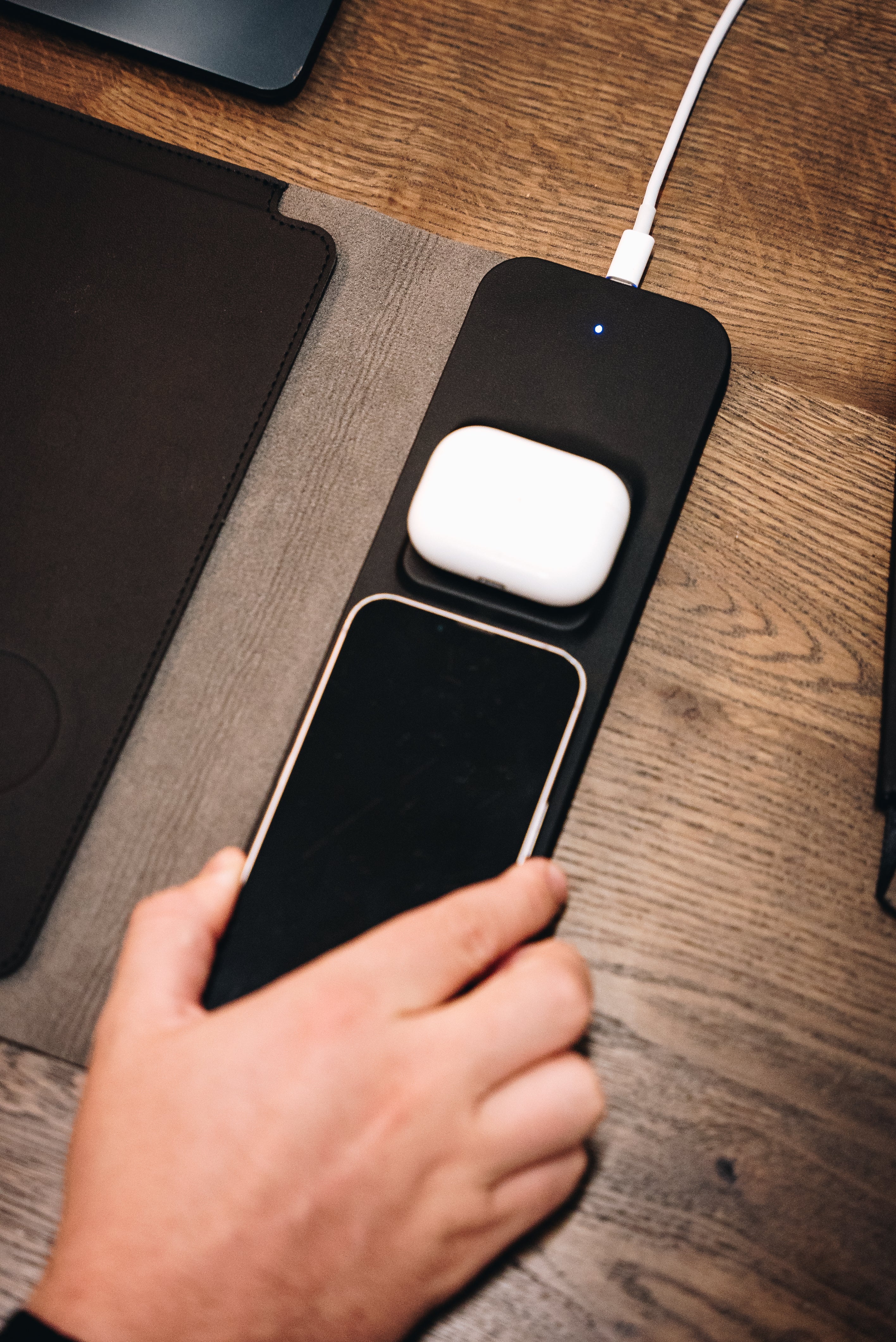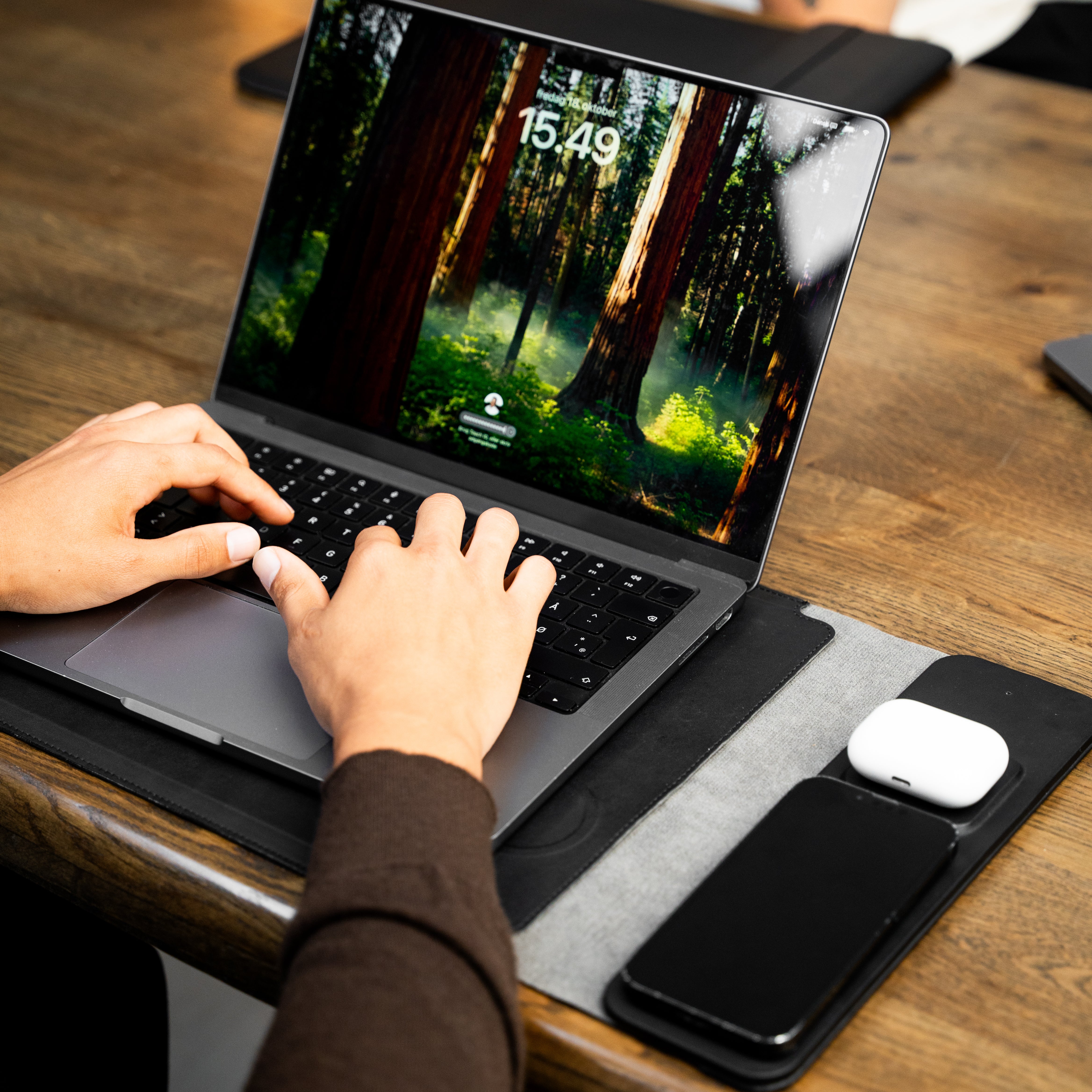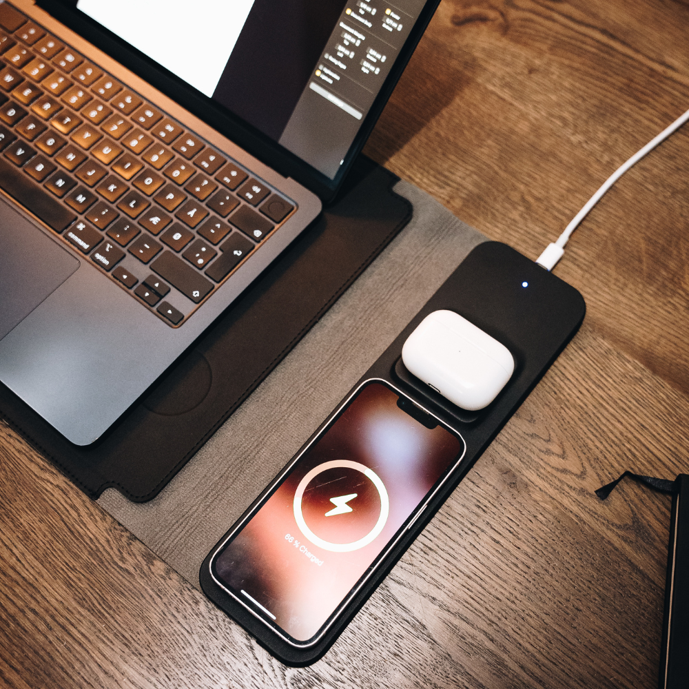 EasySleeve™ fungerer som en 4-i-1 løsning: beskyt din laptop, oplad din telefon og AirPods trådløst, og brug den som musemåtte.